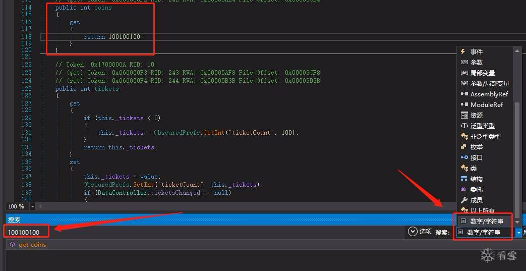 打开dnSpy,将Assembly-CSharp.dll拖拽进dnSpy打开,在搜索选项中选择“数字、字符串”搜索100100100。