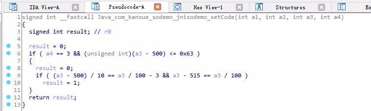 .text:00000EEA ; End of function Java_com_kanxue_sodemo_jnisodemo_setCode可参考伪代码插件,按下F5,看到C代码如下: