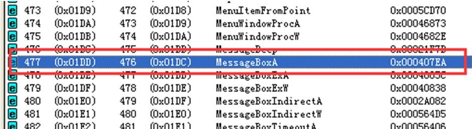 1. 本次实验的最终目标是在成功溢出后弹出一个消息框。那么首先我们要找到消息框的API地址,如果考虑通用性,那么需要一套负责的过程,现在我们先不考虑这些。先使用Windows自带的工具获取API的地址。