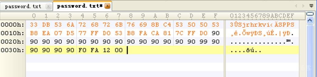 5.2这里我们先不讨论shellcode的编写。这会在接下来的大章节中详细描述。我们直接把弹出消息框的机器码填在password中。