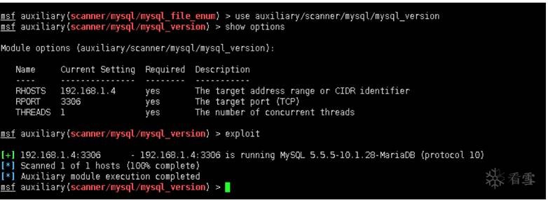 7.auxiliary/scanner/mysql/mysql_version常用于内网中的批量mysql主机发现。