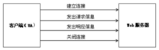 如图所示,它分为四个步骤:建立连接、发出请求信息、发出响应信息、关闭连接。