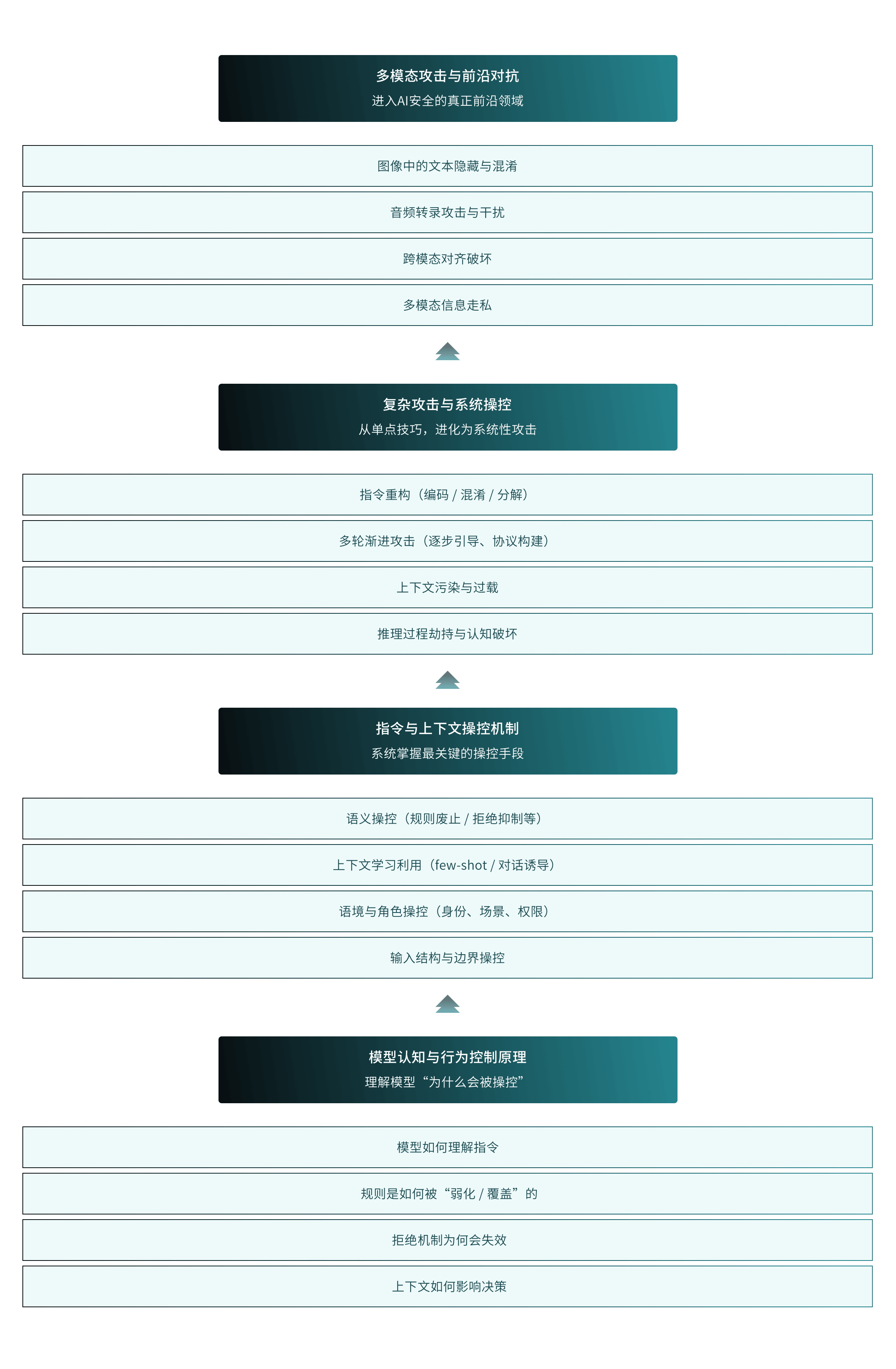 不止学习单点技巧,而是学习如何组合攻击:多轮引导、上下文污染、编码混淆、诱导推理……