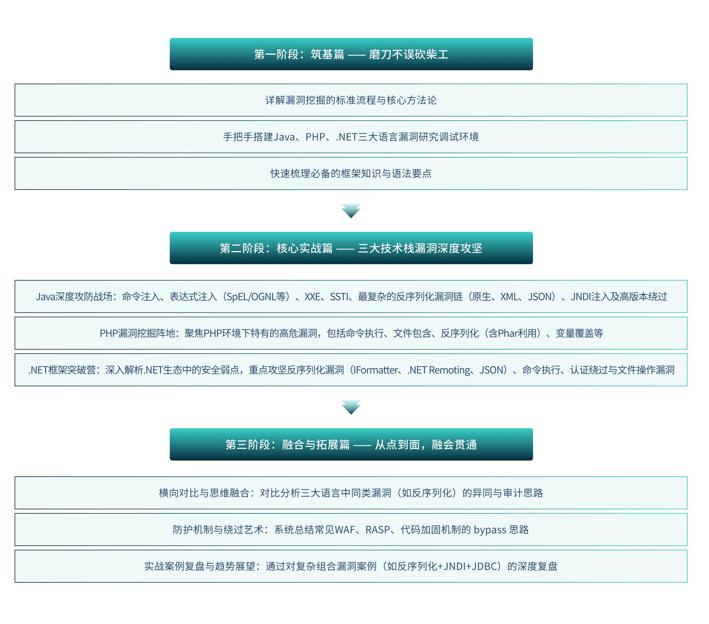 贯通Java、PHP、.NET三大主流Web框架,一次性掌握多技术栈代码审计思路,打破语言壁垒,提升综合技术能力。