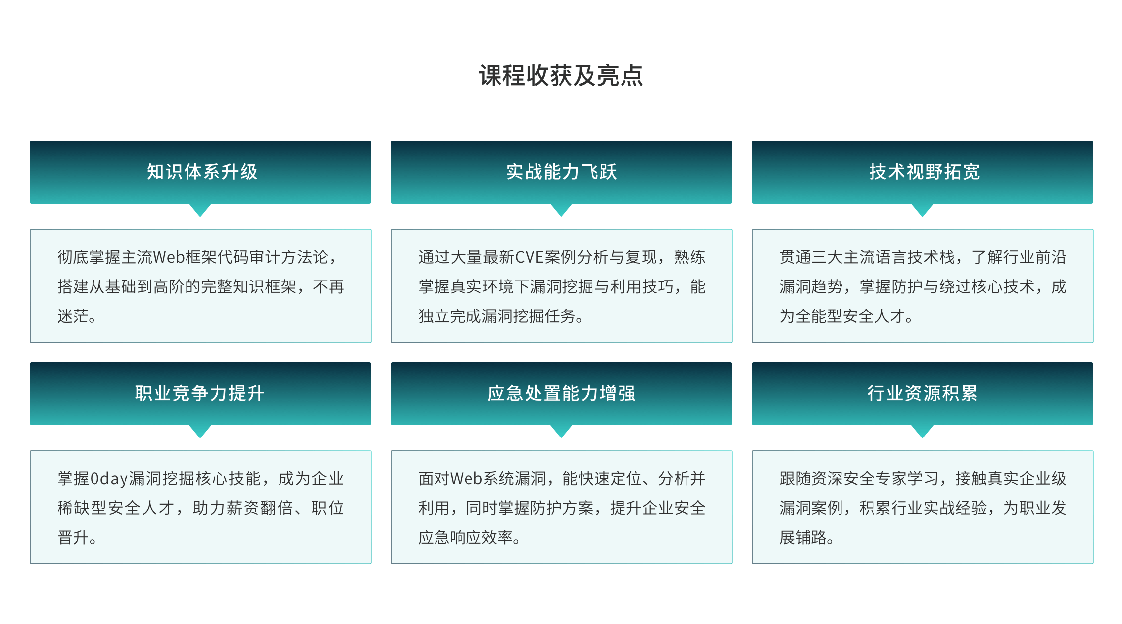 脱离真实案例的学习等于纸上谈兵,课程聚焦近年经典CVE漏洞,手把手复现挖掘全过程,快速衔接职场实战需求。