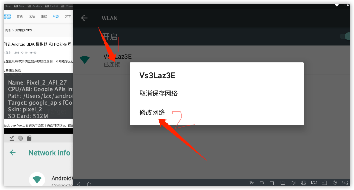 最近在复现ES文件浏览器开放端口漏洞,不知道怎么让Android模拟器和PC端处在同一个局域网内。求教各位大佬。